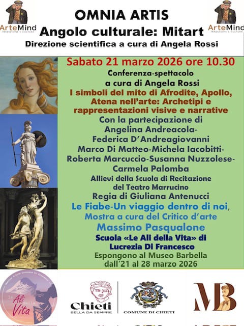 DOMANI, sabato 21 marzo 2026, il Museo Barbella di Chieti inaugura “Le Fiabe – Un Viaggio Dentro di Noi”, una mostra d’arte che presenta 54 opere create con il Metodo ArKa (Arte, Archetipi, Anima) dalla Scuola “Le Ali della Vita”.