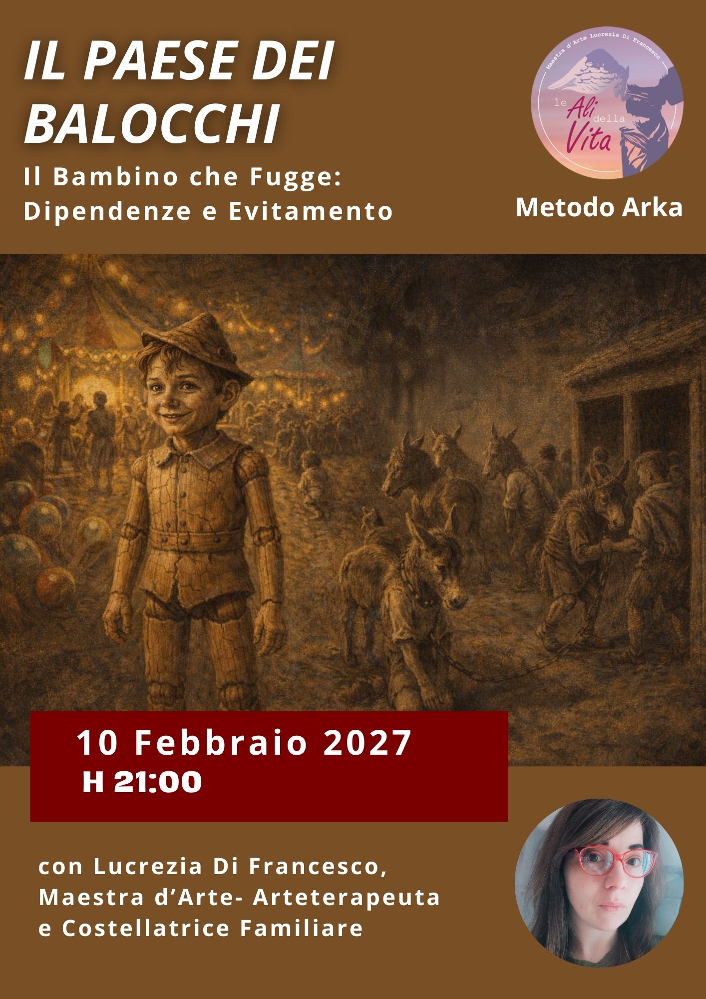 Attraverso respirazione per sentire il vuoto, meditazione archetipica nell’Isola che Non C’è, e la creazione di una “gabbia dorata” simbolica, porteremo alla luce cosa cerca veramente il tuo bambino quando fugge nel Paese dei Balocchi.